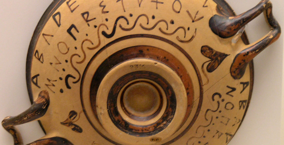Imatge de l’article:  Kílix. Peça arqueològica amb l’alfabet grec arcàic. Museu arqueològic nacional d’Atenes. https://commons.wikimedia.org/wiki/File:NAMA_Alphabet_grec.jpg