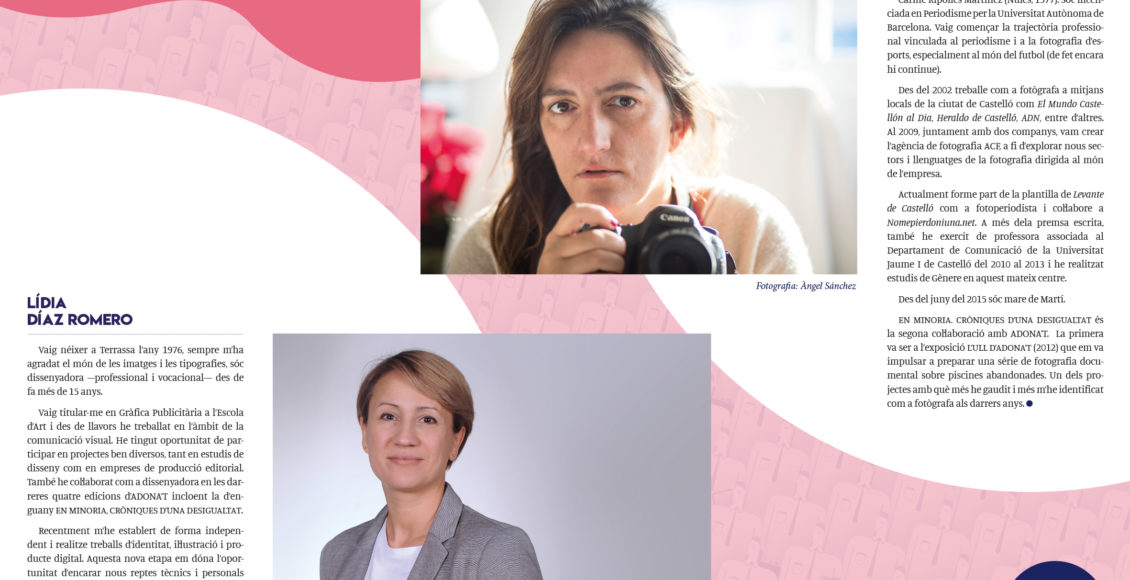 Cada imatge, a més, va acompanyada per una crònica redactada per una periodista de Castelló i les seues comarques. M. Carme Aparisi, Núria Balaguer, Cristina Garcia i Grau, Mònica Gumbau, Lola Oliver, Sara Ortells, Xelo Pastor, Asun Pérez, Lídia Sanchis, Nerea Soriano, Rosabel Tavera, Violeta Tena, Núria Tirado i Marta Ventura han escrit sobre la desigualtat per a ADONA’T.