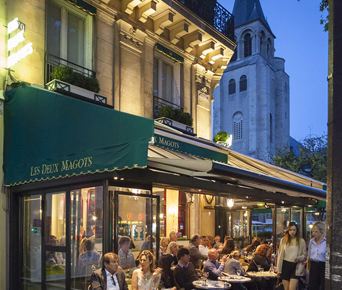 Un bon diumenge que el Lipp era de gom a gom, no en quedava una altra que canviar de vorera i asseure’s al Deux Magots i allí, mentre Gisèle contemplava l’esvelt campanar de l’església de Saint Germain després i li afegia la mirada crítica de temple una mica atrotinat d’una lletjor finament dissimulada, Estée restava embaladida amb uns ulls que li demanaven compassió i que la van corprendre per sempre més. I la van desvestir i la tornaren a abillar i la van trasbalsar i li van ensenyar els plaers de la vida que sols xuclava des dels escenaris i des de les cadires vermelles del Lipp. Aquells ulls que li van substituir el blau de les hortènsies per l’atzur de les pupil·les d’Yves, un mec faquin*, el mag de la comédie d’un París contaminat de sentors a natures que tot just despertava de la fredor d’un llarg hivern mudat de dues ombrel·les, una blava i l’altra carmí. D’un hivern parisenc amb dues finestres que lluïen alhora. I de gelats i coques de poma i uns perfums amigables que duien la solera de vint anys.