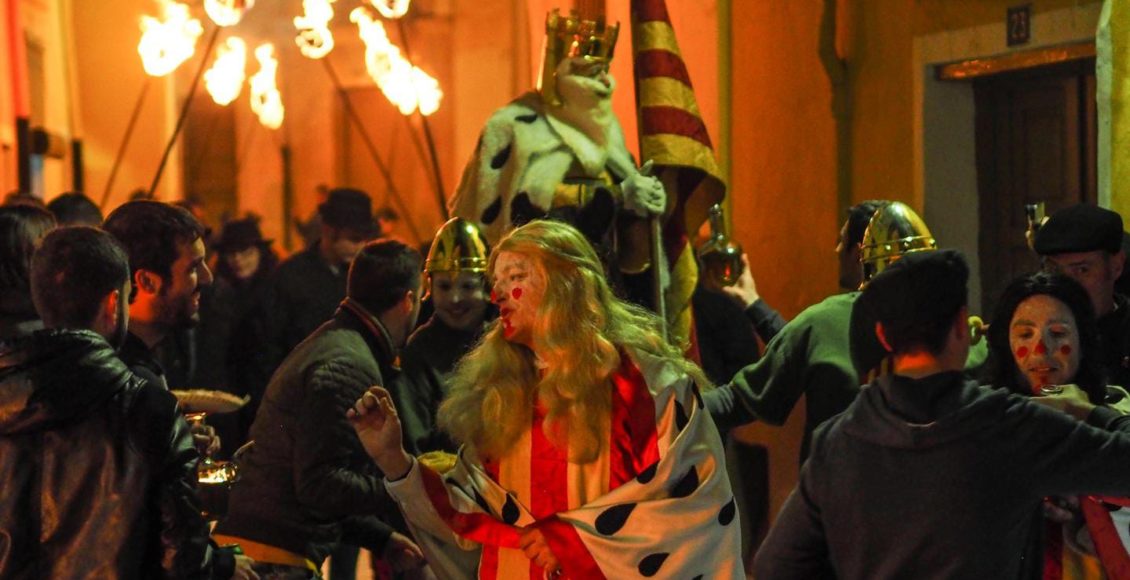 No fa ni vint minuts que el Rei ha eixit del “palau”, coronat, brandant la quadribarrada, acompanyat del seu seguici. Amb la cara emblanquinada i les galtes enrogides. Un parell de bufons, dansaires alegres que ballen al pas de cada foguera, l’acompanyen amb el rostre il·luminat pel foc. A les regnes del cavall, els ‘simileros’, un parell de soldats que mantenen en calma l’animal. La gent, arremolinada a les portes, esclata amb el primer grall de la dolçaina i arranca a caminar per a acompanyar la cavalcada.