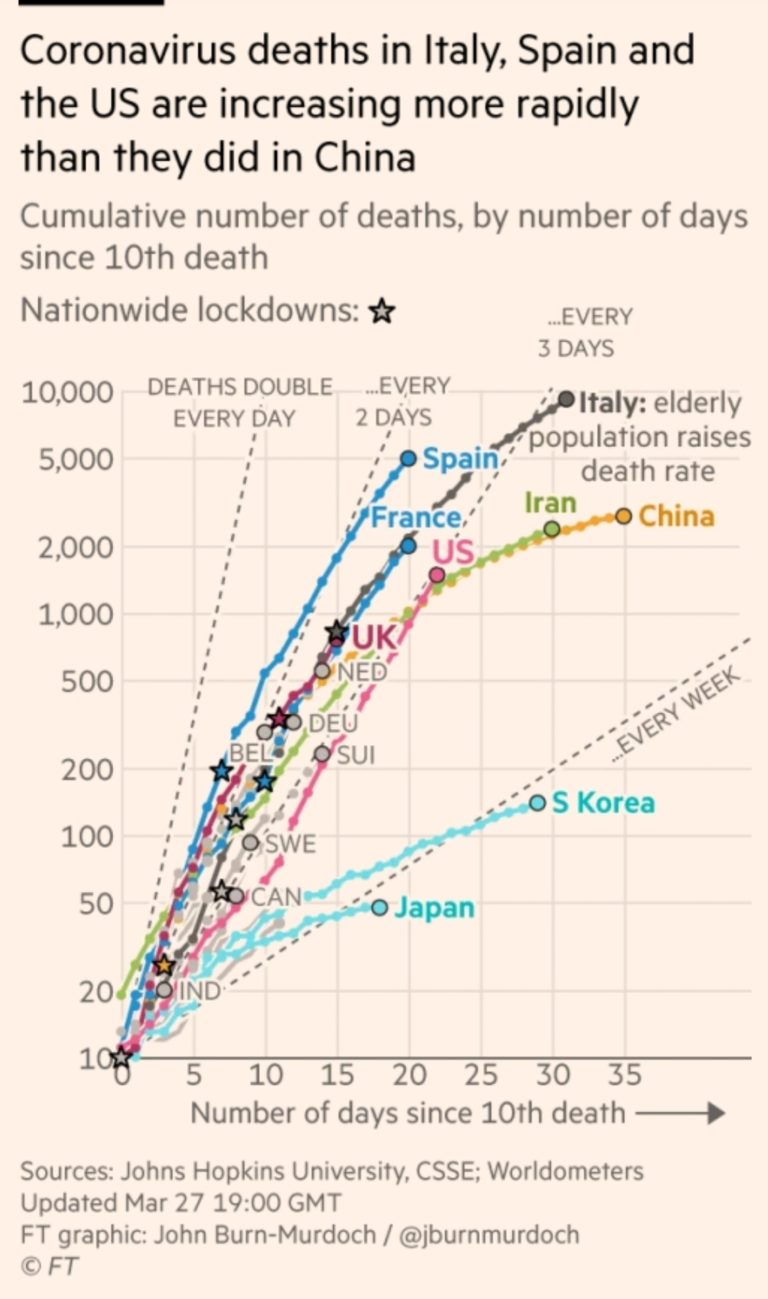 Els gràfics de creixement de nombre de morts per la infecció de coronavirus posen Espanya en un paper destacat en comparació amb altres estats arreu del món. La velocitat d’augment del nombre de morts és enorme, i està a punt de superar Itàlia en la dolorosa quantitat. Espanya és assenyalada en la premsa internacional com un epicentre de la infecció.