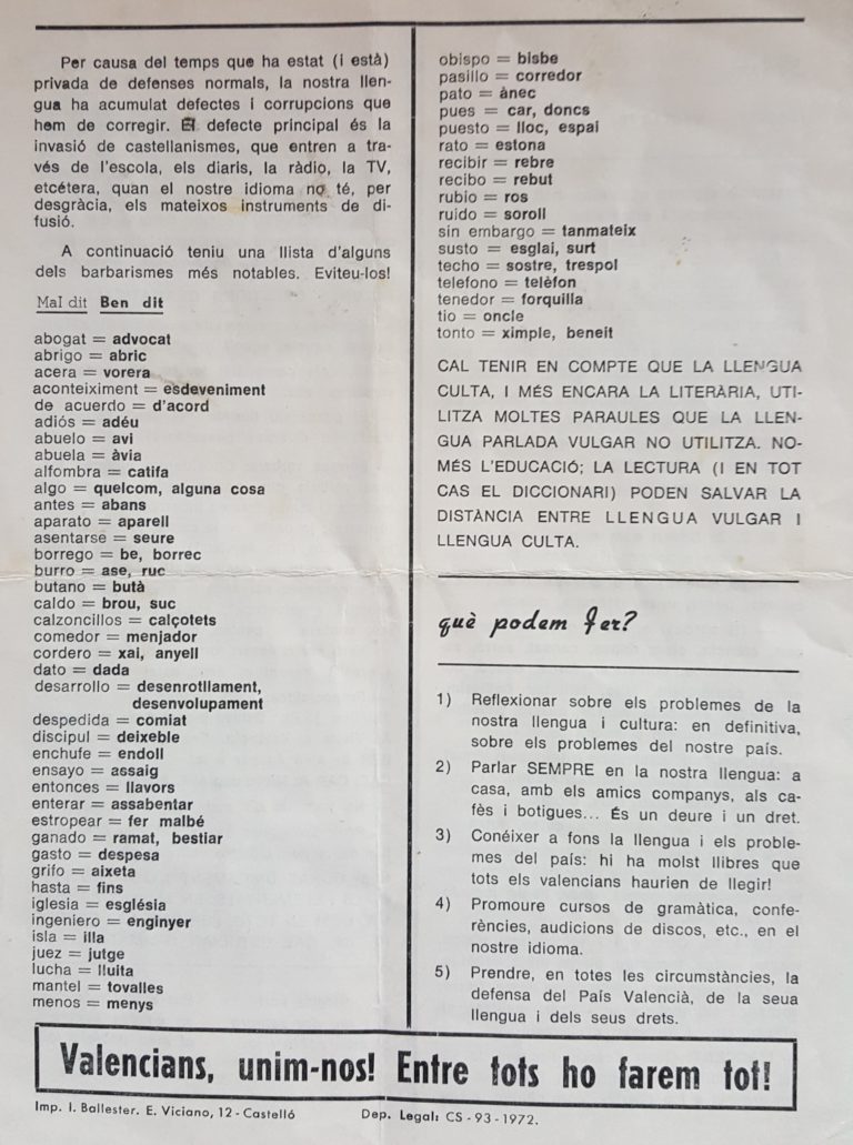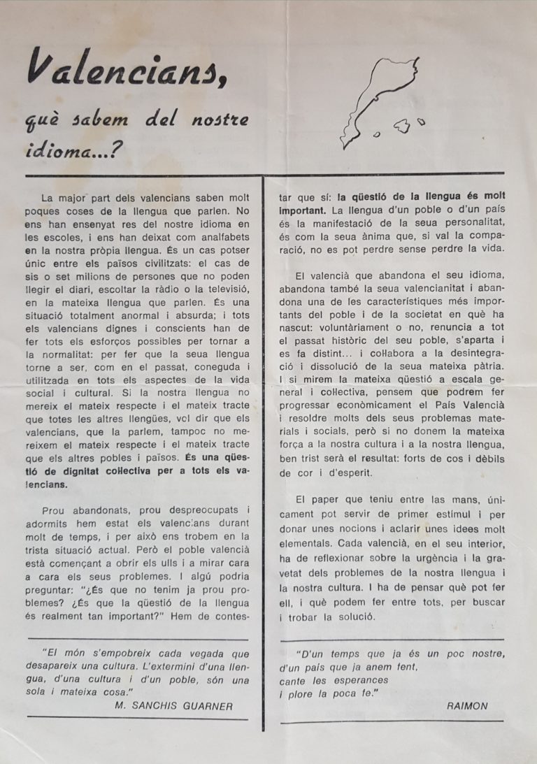 El paper que teniu entre les mans únicament pot servir de primer estímul, i per donar unes nocions i aclarir unes idees molt elementals. Cada valencià, en el seu interior, ha de reflexionar sobre la urgència i la gravetat dels problemes de la nostra llengua i la nostra cultura. I ha de pensar què pot fer ell, i què podem fer entre tots, per buscar i torbar la solució.