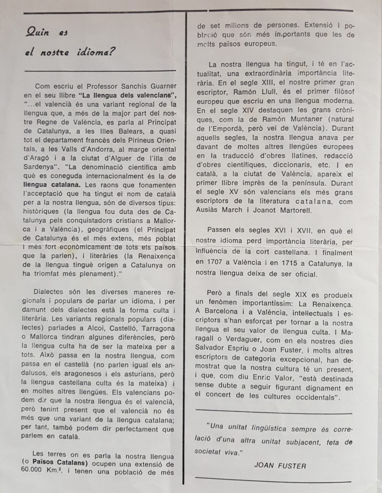Prou abandonats, prou despreocupats i adormits hem estat els valencians durant molt de temps, i per això ens trobem en la trista situació actual. Però el poble valencià està començant a obrir els ulls i a mirar cara a cara els seus problemes. I algú podria preguntar: “¿És que no tenim ja prou problemes? ¿És que la qüestió de la llengua és realment tan important?” Hem de contestar que sí: la qüestió de la llengua és molt important. La llengua d’un poble o d’un país és la manifestació de la seua personalitat, és com la seua ànima que, si val la comparació, no es pot perdre sense perdre la vida.