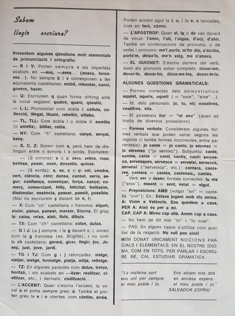 La major part dels valencians saben molt poques coses de la llengua que parlen. No ens han ensenyat res del nostre idioma en les escoles, i ens han deixat com analfabets en la nostra pròpia llengua. És un cas potser únic entre els països civilitzats: el cas de sis o set milions de persones que no poden llegir el diari, escoltar la ràdio o la televisió, en la mateixa llengua que parlen. És una situació totalment anormal i absurda; i tots els valencians dignes i conscients han de fer tots els esforços possibles per tornar a la normalitat: per fer que la seua llengua torne a ser, com en el passat, coneguda i utilitzada en tots els aspectes de la vida social i cultural. Si la nostra llengua no mereix el mateix respecte i el mateix tracte que totes les altres llengües, vol dir que els valencians, que la parlem, tampoc no mereixem el mateix respecte i el mateix tracte que els altres pobles i països. És una qüestió de dignitat col·lectiva per a tots els valencians.