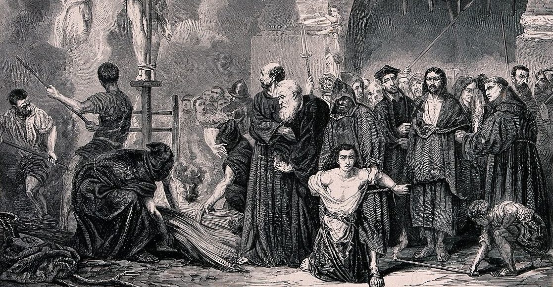 Imatge: An auto-da-fé of the Spanish Inquisition and the execution of sentences by burning heretics on the stake in a market place. Wood engraving by Bocort after H.D. Linton. Wikipedia Commons